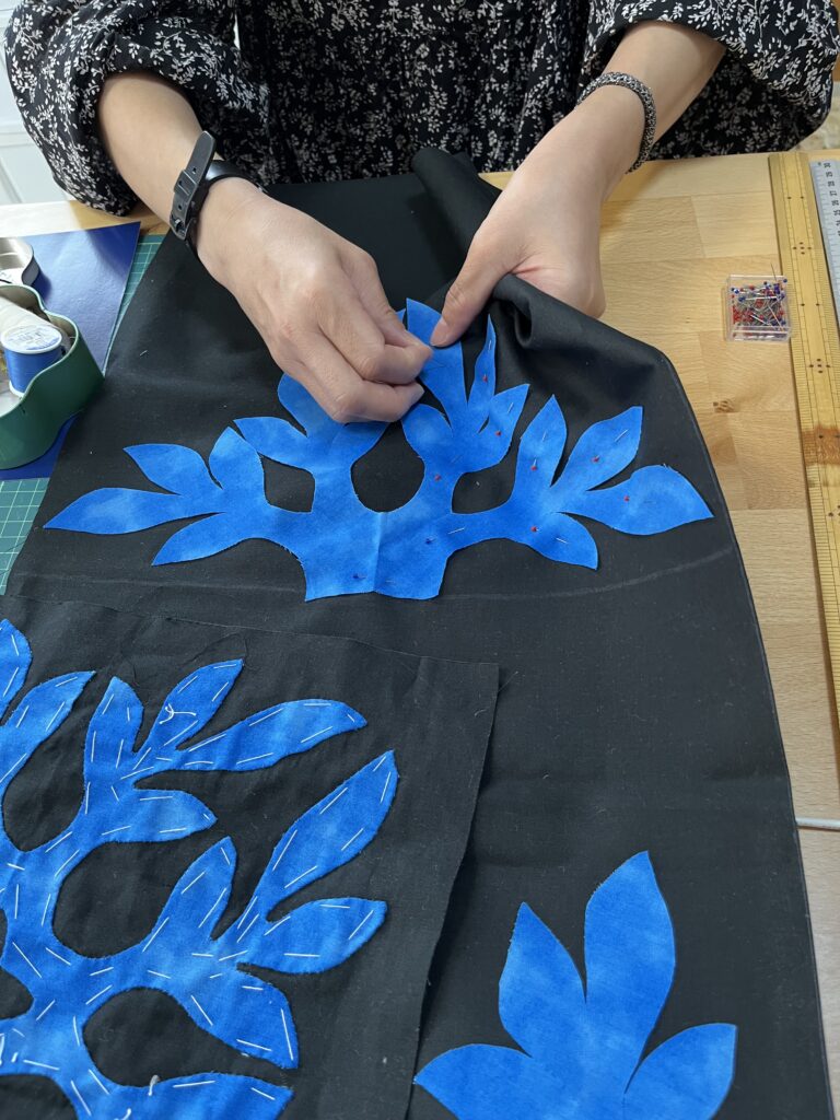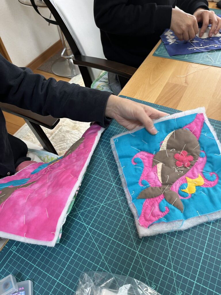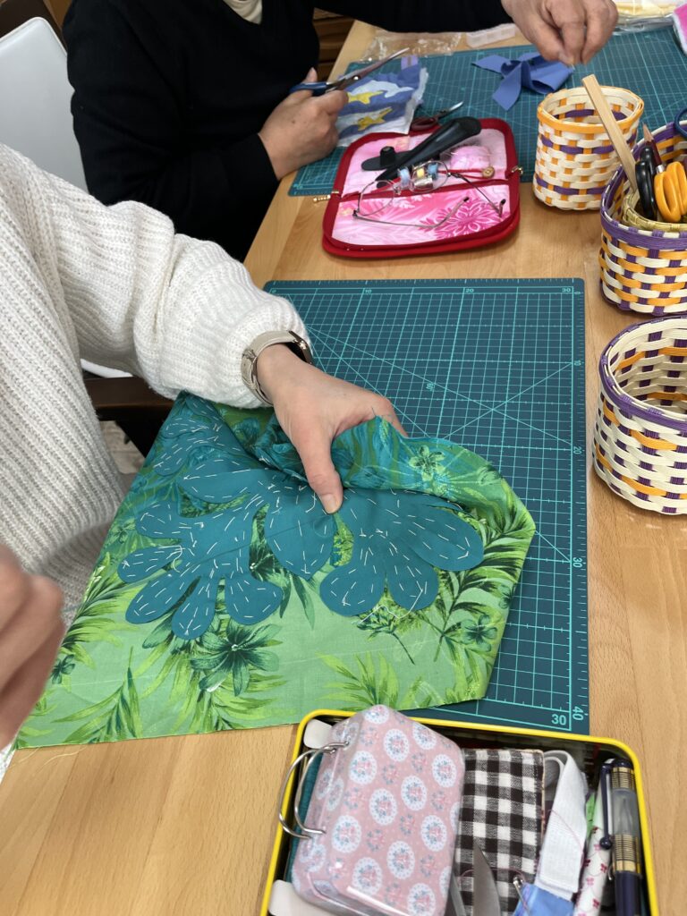 最近のレッスンでは、生徒様自らデザインして大きな作品を作られたり、メッシュ生地でアップリケのみ施してポーチを作られたり、また、ハワイアンキルトにこだわらず、お好きな生地を持ってこられてバッグを作られたり、皆さん活発に製作されています。